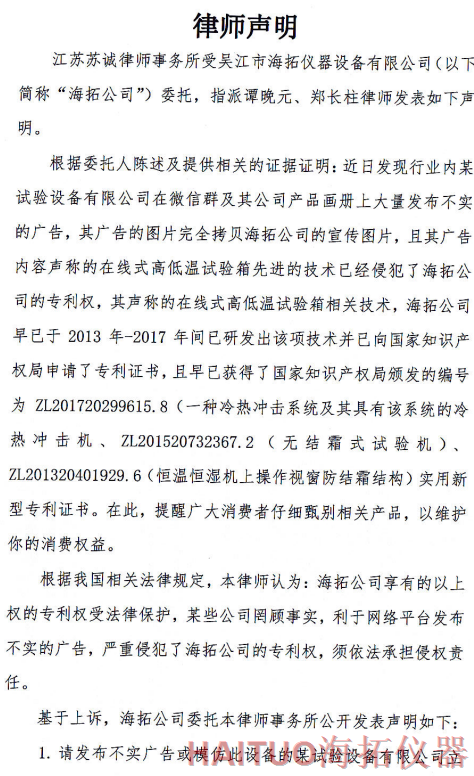 海拓儀器律師聲明:反對(duì)侵權(quán)行為 維護(hù)公司和消費(fèi)者權(quán)益摘要:國(guó)內(nèi)試驗(yàn)設(shè)備領(lǐng)先者吳江市海拓儀器設(shè)備有限公司委托律師事務(wù)所發(fā)布了律師聲明,該聲明指出,當(dāng)前市面上出現(xiàn)了產(chǎn)品專(zhuān)利侵犯海拓儀器權(quán)益,海拓儀器將以法律手段維護(hù)自身利益。該律師聲明要求某試驗(yàn)設(shè)備有限公司立即停止侵權(quán)行為,扯下其在網(wǎng)絡(luò)平臺(tái)的相關(guān)廣告和宣傳畫(huà)冊(cè)并同時(shí)停止生產(chǎn)同款設(shè)備。如果該設(shè)備公司不聽(tīng)勸解,海拓儀器將向人民法院依法起訴該公司侵權(quán)行為,以維護(hù)自身合法權(quán)益和維護(hù)客戶(hù)消費(fèi)權(quán)益,并建議廣大消費(fèi)者仔細(xì)甄別相關(guān)產(chǎn)品。? ? ? ?近日,吳江市海拓儀器設(shè)備有限公司委托律師事務(wù)所發(fā)布了律師聲明,該聲明指出,當(dāng)前市面上出現(xiàn)了產(chǎn)品專(zhuān)利侵犯海拓儀器權(quán)益,海拓儀器將以法律手段維護(hù)自身利益。??事件源起于海拓儀器發(fā)現(xiàn)市面上有同類(lèi)設(shè)備公司通過(guò)完全拷貝海拓儀器產(chǎn)品宣傳圖片,在微信群及該公司產(chǎn)品畫(huà)冊(cè)上大量發(fā)布不實(shí)廣告。??聲明指出,該廣告聲稱(chēng)的在線式高低溫試驗(yàn)箱的技術(shù)侵犯了海拓儀器的專(zhuān)利權(quán),該產(chǎn)品專(zhuān)利由海拓儀器