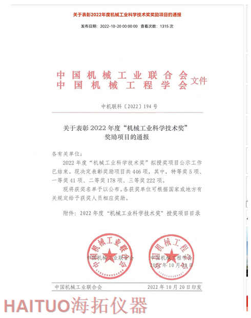 海拓儀器榮獲2022年度中國(guó)機(jī)械工業(yè)科學(xué)技術(shù)獎(jiǎng)?ICC訊?10月20日,2022年度“中國(guó)機(jī)械工業(yè)科學(xué)技術(shù)獎(jiǎng)”項(xiàng)目名錄正式發(fā)布,由海拓儀器(江蘇)有限公司完成的“超快速冷熱沖擊試驗(yàn)系統(tǒng)關(guān)鍵技術(shù)研究與系列應(yīng)用”項(xiàng)目榮獲2022年度“中國(guó)機(jī)械工業(yè)科學(xué)技術(shù)獎(jiǎng)”三等獎(jiǎng)。??據(jù)了解,中國(guó)機(jī)械工業(yè)科學(xué)技術(shù)獎(jiǎng)是根據(jù)《國(guó)家科學(xué)技術(shù)獎(jiǎng)勵(lì)條例》和《社會(huì)力量設(shè)立科學(xué)技術(shù)獎(jiǎng)管理辦法》的有關(guān)規(guī)定,由中國(guó)機(jī)械工業(yè)聯(lián)合會(huì)和中國(guó)機(jī)械工程學(xué)會(huì)共同設(shè)立并經(jīng)國(guó)家科學(xué)技術(shù)部批準(zhǔn),在國(guó)家科技獎(jiǎng)勵(lì)主管部門(mén)登記的面向全國(guó)機(jī)械行業(yè)的綜合性科技獎(jiǎng)項(xiàng)。旨在表彰在機(jī)械工業(yè)科技工作中作出突出貢獻(xiàn)的單位和人員,獎(jiǎng)勵(lì)范圍包括:機(jī)械工業(yè)科學(xué)技術(shù)發(fā)明成果、機(jī)械工業(yè)科學(xué)技術(shù)進(jìn)步成果、機(jī)械工業(yè)工程化和新技術(shù)推廣成果和機(jī)械工業(yè)軟科學(xué)和標(biāo)準(zhǔn)成果。??海拓儀器是一家集研發(fā)、制造、貿(mào)易于一體高科技現(xiàn)代化公司,公司成立于2005年,主要產(chǎn)品包括:超快速冷熱沖擊試驗(yàn)機(jī)(熱流儀)、快速溫變應(yīng)力篩選試驗(yàn)箱(ESS),